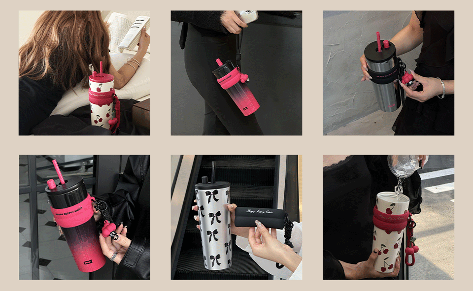 24 oz Stainless Steel Tumbler with Lid and Straw, Insulated Water Bottle Leak Proof for Hot and Cold, Portable Travel Coffee Mug, Reusable Coffee Cup for Women, Black&Pink